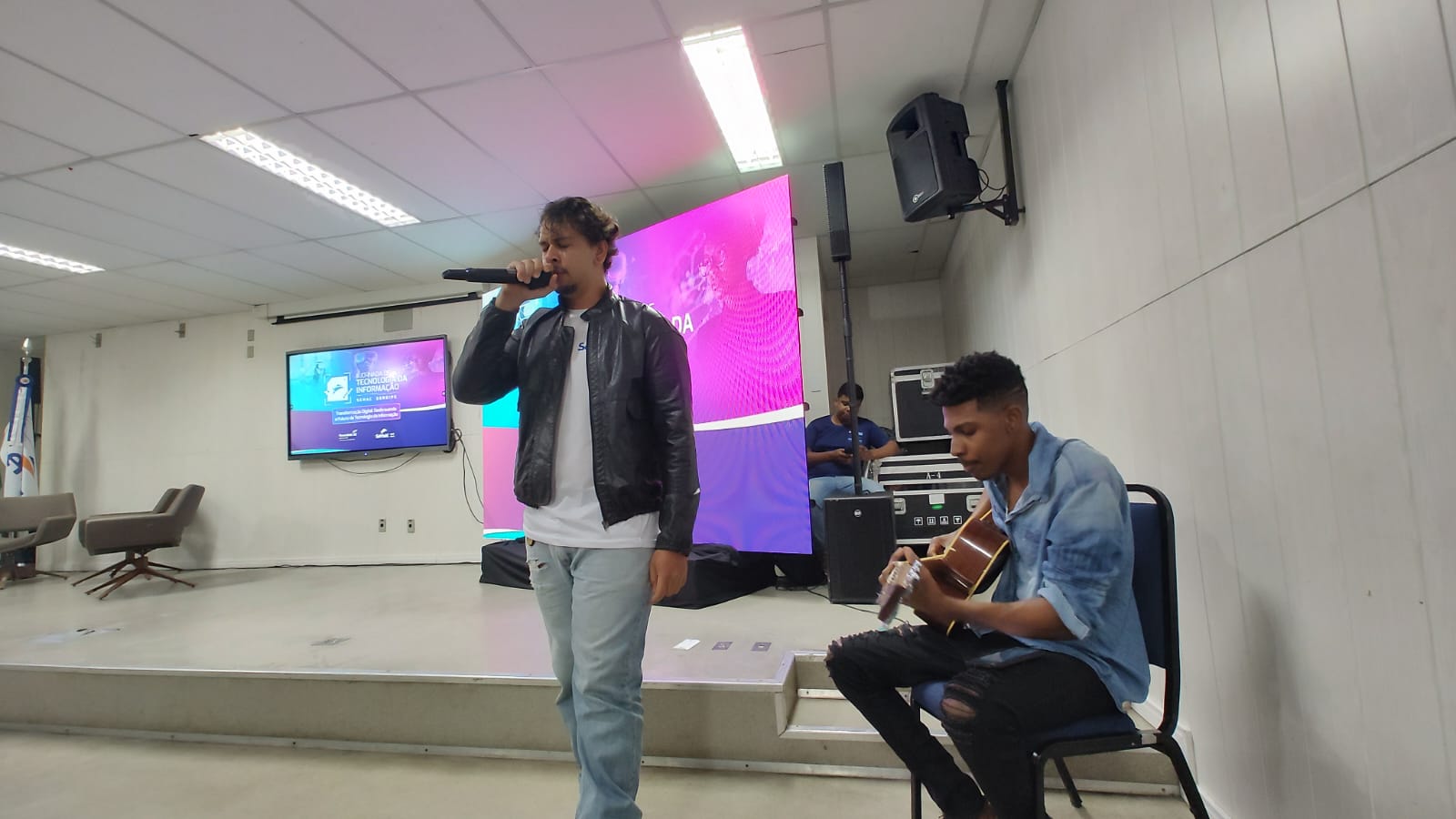 Os participantes da II Jornada de Tecnologia do Senac foram recepcionados ao som de pop rock, cantado e tocado pela dupla Jorge e Júnior, alunos do curso Técnico em Eventos. Contando com palestras, oficinas e mesa redonda, o evento realizado no Centro de Educação Profissional (CEP) de Aracaju foi uma imersão nos avanços tecnológicos e os impactos causados nas profissões e na educação. Cerca de 230 pessoas participaram dos dois dias do evento, realizado nos dias 13 e 14 de setembro.