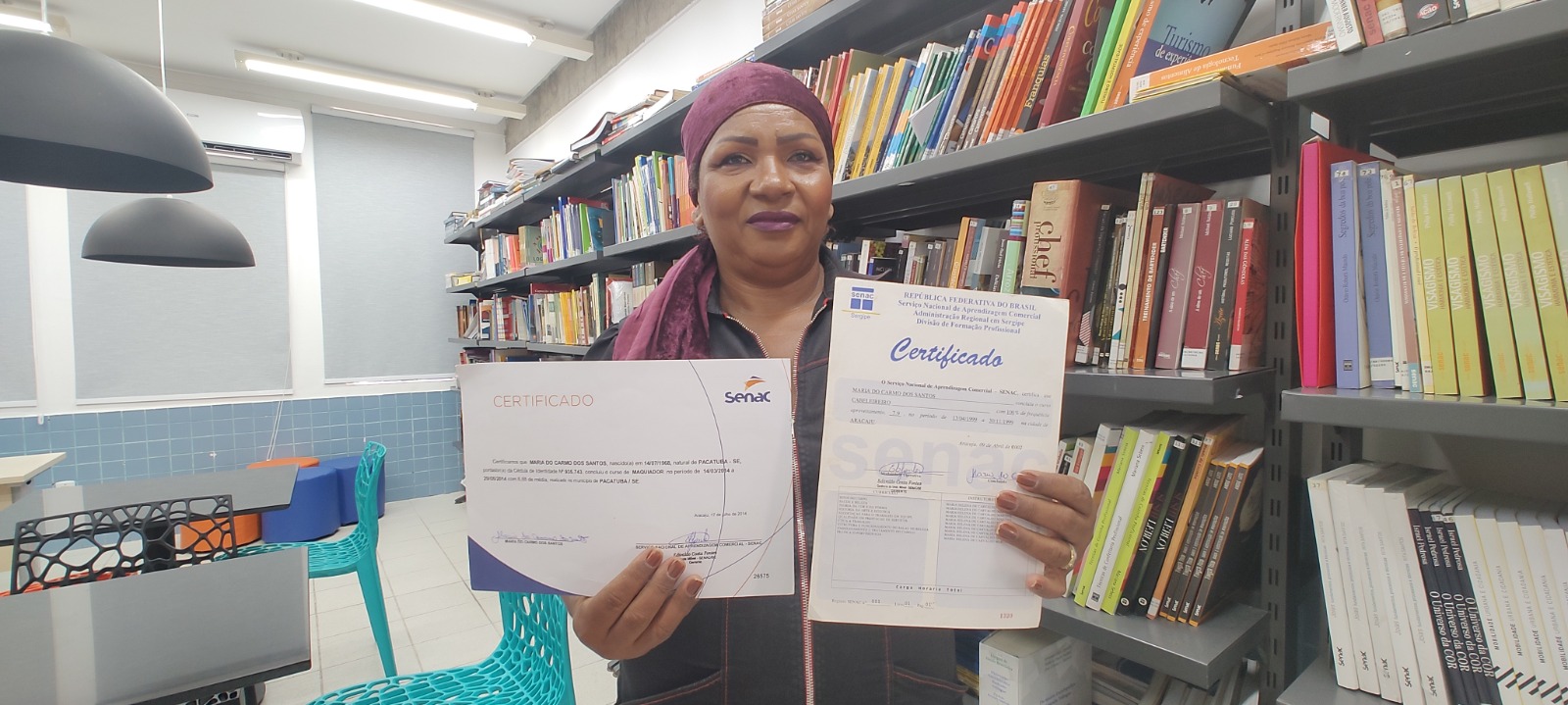 “Fui para o Rio de Janeiro trabalhar numa casa de repouso e chegando lá, também comecei a trabalhar num dos salões de beleza mais famosos da Barra da Tijuca na época, especializado em atendimento de negros. Para fazer parte da equipe, era feita uma prova prática e o meu trabalho foi aceito de primeira. Todos quiseram saber onde tinha feito o curso e disse que tinha sido no Senac, em Sergipe. Ter a certificação do Senac teve um grande peso para conquistar uma vaga”, relembra ela, complementando que vários artistas eram clientes do local.