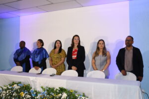 O dispositivo de honra do evento contou com a presença do coordenador dos cursos de comunicação, Cláudio Cândido; da gerente do núcleo pedagógico, Flávia Regina Ribeiro Moura; da analista pedagógica Andréa Figueiredo; e do patrono da turma, o analista pedagógico Franklin Timóteo Souza do Espírito Santo.