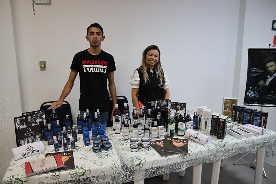 A Grandha Cosméticos trouxe um leque de produtos voltados para a terapia capilar masculina. “A nossa linha de dermocosméticos é toda voltada para a questão da saúde e bem-estar, tanto para cabelos quanto pra a barboterapia”, informou Sirleide da Silva, técnica de empresa, responsável por Sergipe e Alagoas.